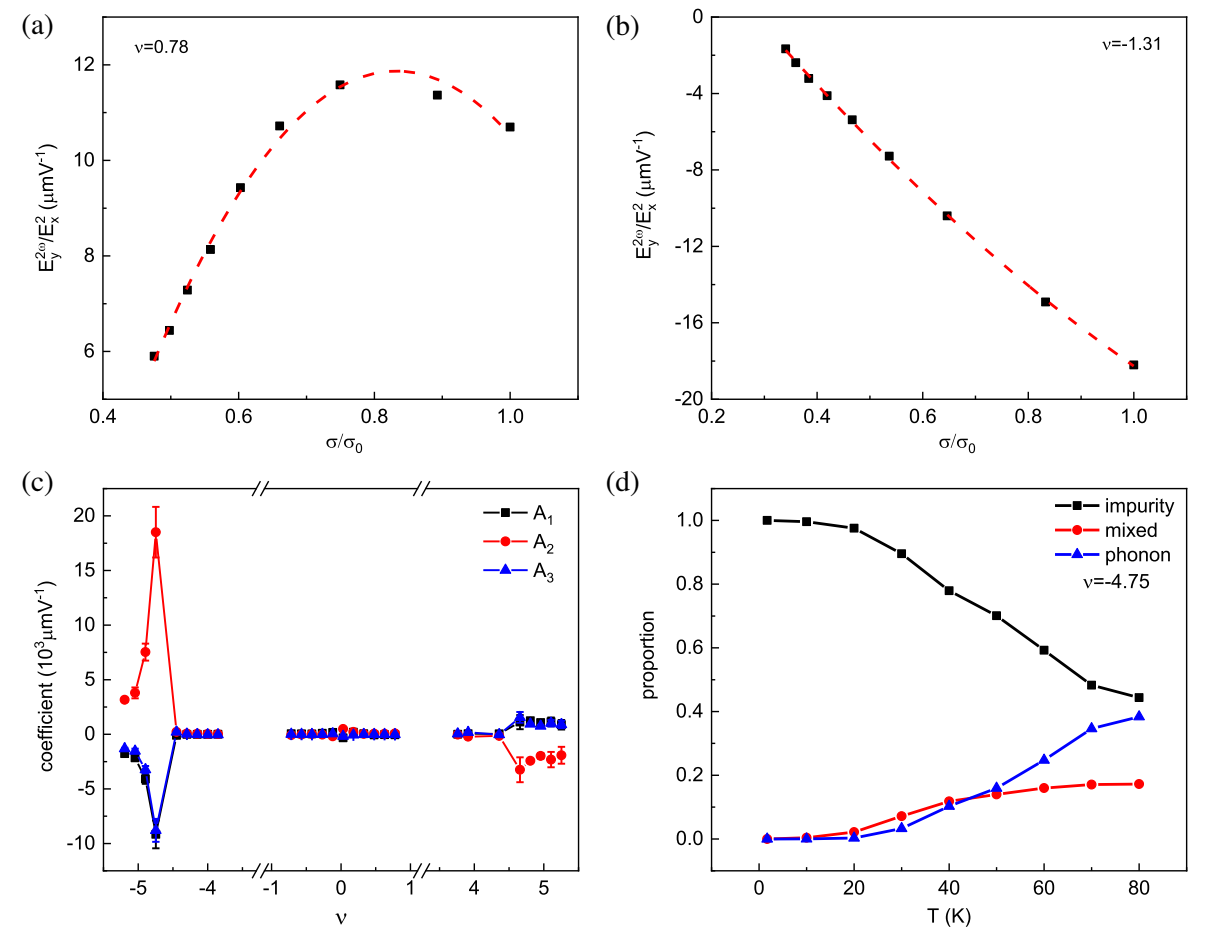 In this study, the researchers report a comprehensive experiment identifying the disorder-related mechanisms of the NLHE in TBG. An extremely large second-order Hall conductivity is observed close to the moiré superlattice gaps, orders higher than the values obtained in WTe2 and twisted WSe2 systems, see Figure 1. The scaling results of the NLHE extracted from temperature-dependent measurements well matches the general scaling relation, with a component which has not been reported. According to the scaling parameters, the researchers identify that the NLHE is dominated by multiple skew-scattering contributions. Especially, the phonon skew-scattering plays a comparable role as the impurity skew-scattering in the NLHE, see Figure 2.