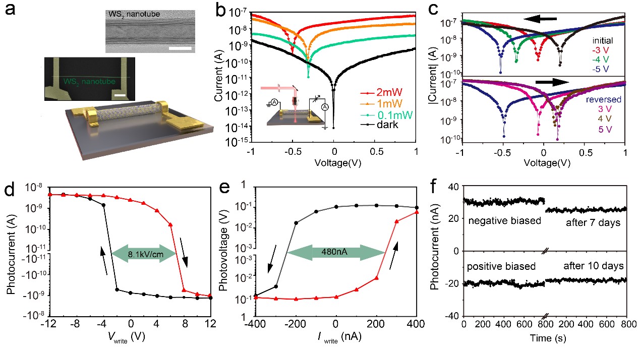 Figure 1 WS2 nanowire PV-RAM device (a) device schematic diagram (b) photovoltaic response of the device (c) programmability of photovoltaic response,