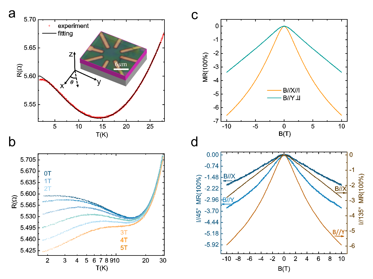 The Junxi Duan and Yugui Yao's team in BIT has been steadfastly committed to investigating the transport properties of novel topological and quantum materials. To realize the heterodimensional Kondo superlattice, the research team used VS2-VS heterodimensional superlattice as the representative system, which was first synthesized by Jiadong Zhou [Nature 609, 46–51 (2022)]. In the study, the team discovered: (1) The VS2-VS heterodimensional superlattice exhibited the low-temperature resistance upturn and the negative magnetoresistance (NMR), which are typical characteristics of the Kondo effect. Interestingly, the dependence of these two phenomena on the magnetic field showed strong anisotropy, as illustrated in Figure 1. (2) With a circular disc device, the anisotropic NMR is determined to originate from the anisotropic splitting of the Kondo resonance induced by magnetic anisotropy, as shown in Figure 2. (3) By extracting the Landé factor and Curie temperature, and combining with the first-principles calculations, the unique anisotropy Kondo effect is determined to originate from the magnetic anisotropy which has the root in the unique 1D chains in the structure, as depicted in Figure 3.