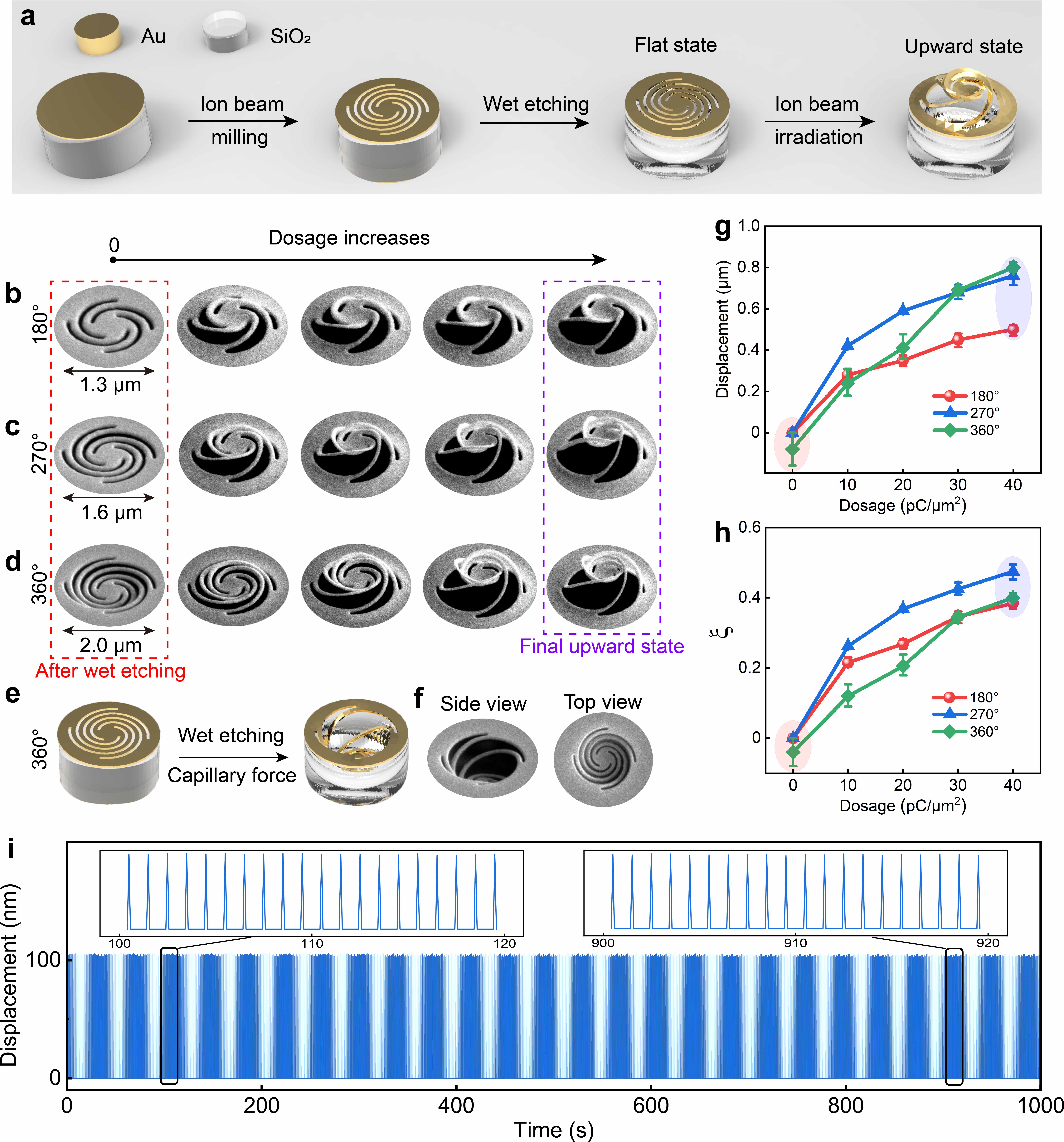 在极小的空间尺度内制备大形变度纳米剪纸结构,并获得高性能的动态调控是微纳光机电领域的一项重要挑战。在该工作中研究团队创新地提出并实现了一种基于合成设计策略的超高形变度纳米剪纸结构(图1)。通过精心设计基于阿基米德螺旋曲线的纳米剪纸构型,利用数值分析结构形变过程的应力和应变分布变化,阐释出结构易于产生大形变的力学机制。实验上,采用团队所发展的纳米剪纸三维微纳制造技术,成功精准制备出多种结构参数的合成纳米剪纸结构,并借助原子力显微镜(AFM)的高精密纳米尺度力学表征手段,开展了合成纳米剪纸结构的循环压力测试,论证了结构持久的弹性形变特征(图2)。