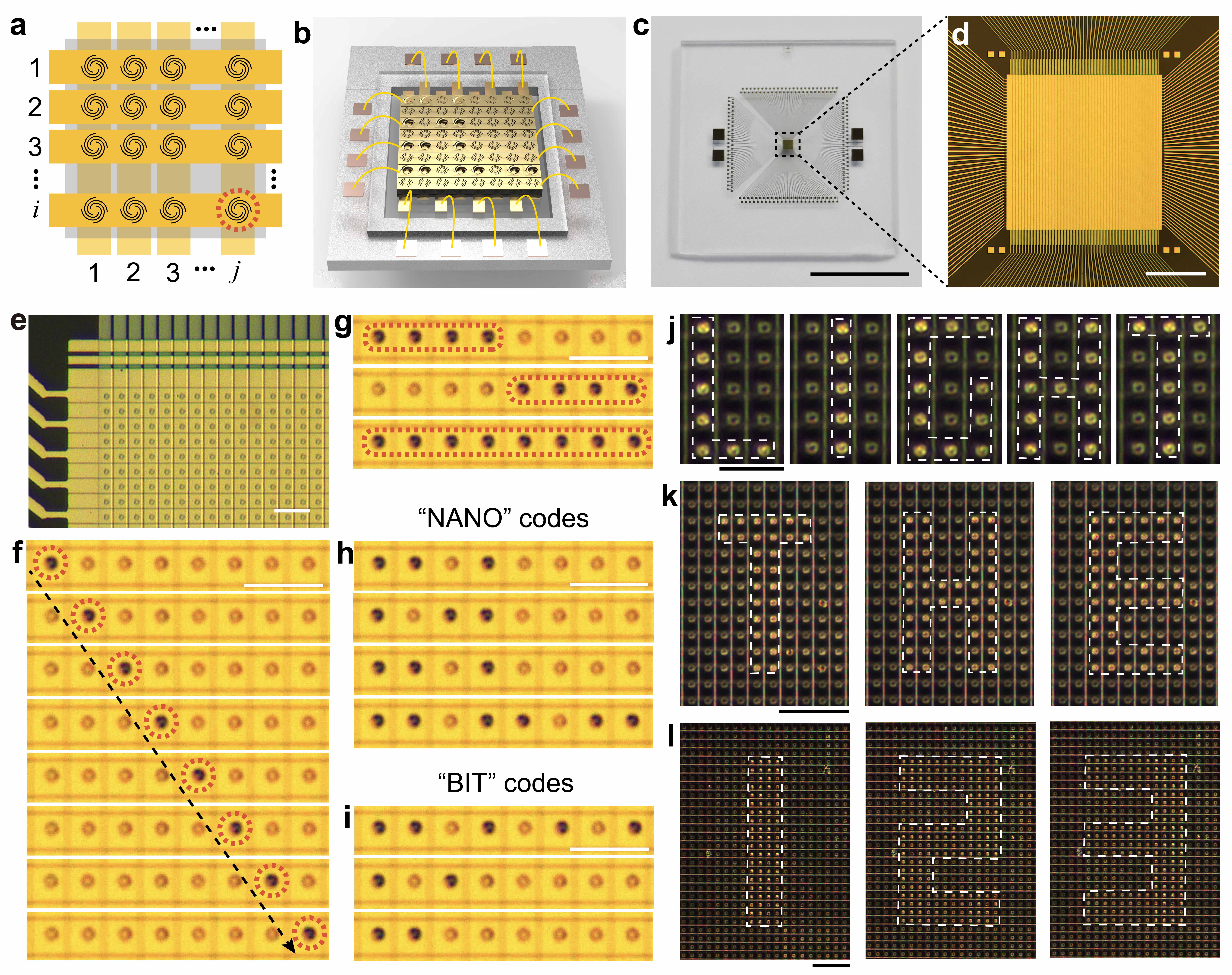 图3. 合成纳米剪纸结构阵列的像素化自由编码信息显示。