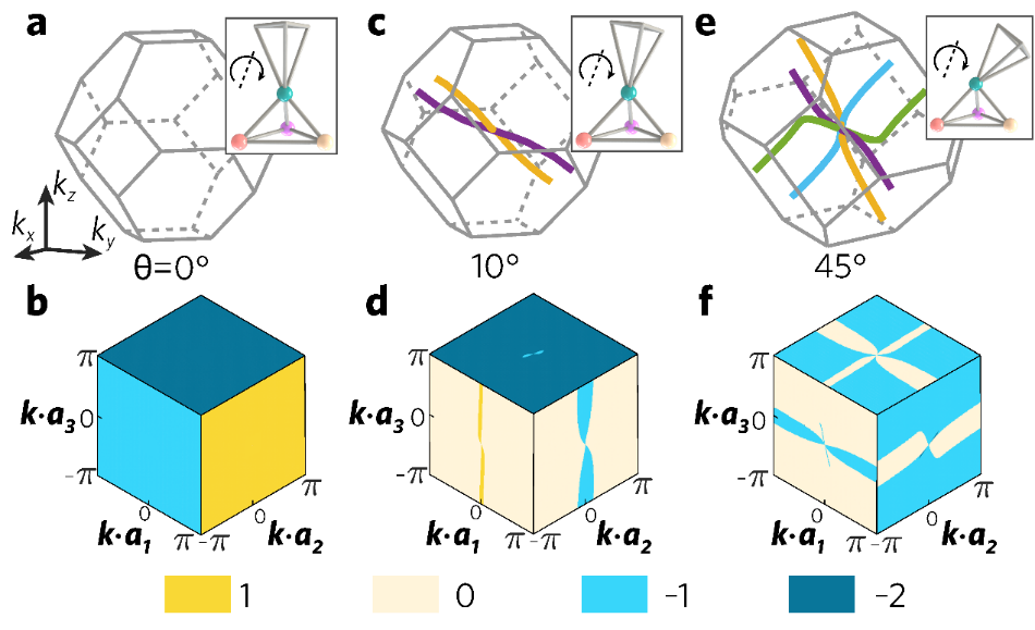 该团队利用整体剪切变形模式,能够在不重新组装晶格模型的情况下改变晶格的几何参数,进而使得3D打印的广义焦绿石晶格可以简便地在完全拓扑极化相和外尔相之间相互转变。图2 (a,c,e)展示了广义焦绿石晶格在一个整体剪切模式中达到的三种不同拓扑相,分别是完全拓扑极化相(a)、具有两条外尔线的外尔相(c)和具有四条外尔线的外尔相(e)。如图2(b)所示,完全拓扑极化相在整个布里渊区具有相同的拓扑极化矢量,与此相对的,外尔相的拓扑极化矢量则依赖于具体的布里渊区中波矢的选择。
