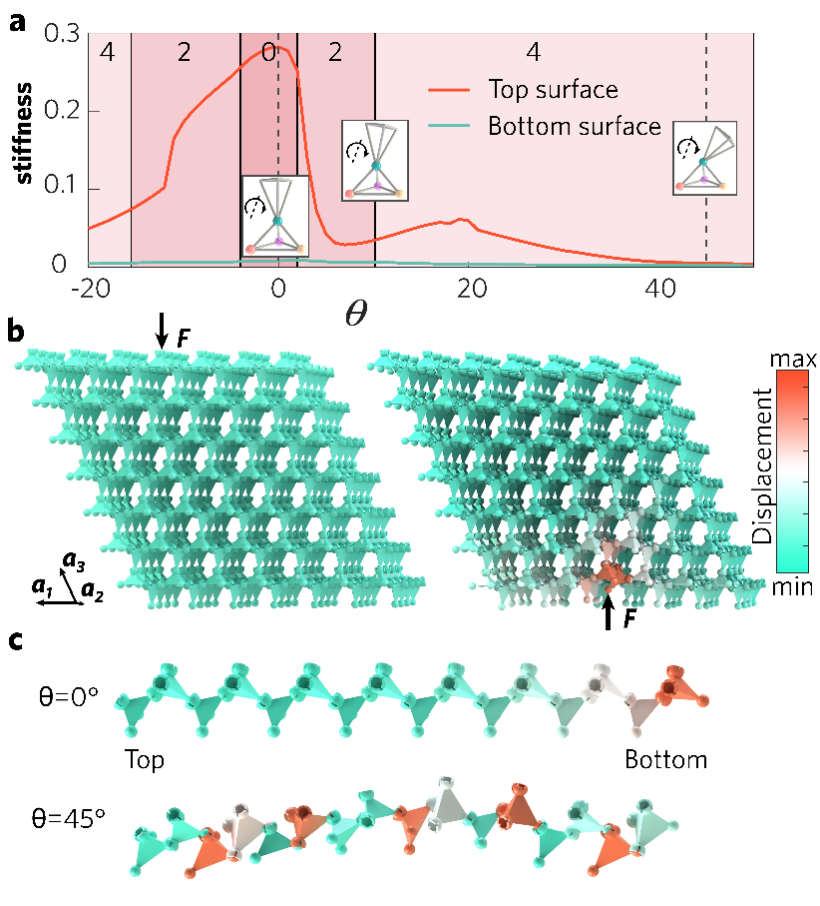 该团队对广义焦绿石晶格进行了关于表面力学的数值仿真。图3(a)表明晶格上下表面的刚度之比在晶格从完全拓扑极化相转变为外尔相的过程中快速降低。在图3(b)中,θ=0°的完全拓扑极化相在点外力的作用下展现出强烈不对称的表面力学响应。图3(c)则展示了完全拓扑极化的力学软模与外尔相中的外尔软模在空间分布上的明显差别,前者局域于晶格的某一侧边界,后者则贯穿了整个晶格。