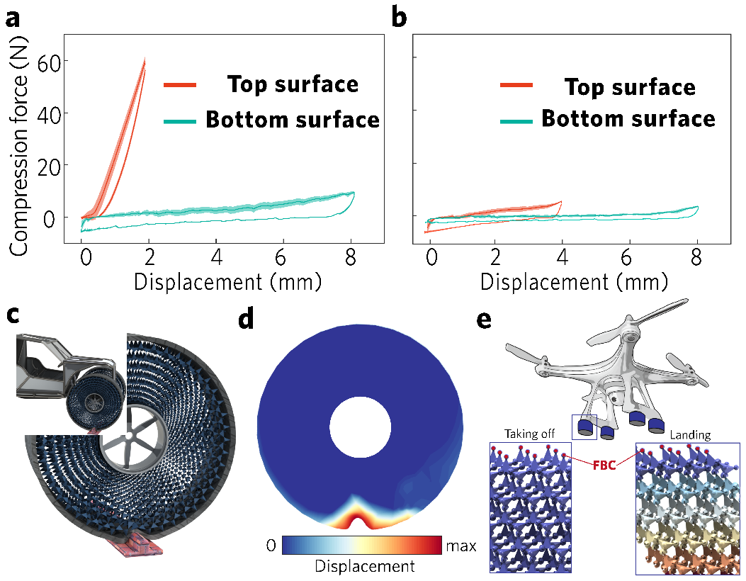 图4 3D打印的广义焦绿石晶格的实验测量。(a)-(b)分别为拓扑完全极化相和外尔相的力-位移曲线的测量结果。(c) 广义焦绿石晶格构成的多孔拓扑轮胎。(d) 数值分析在崎岖地形上滚动时拓扑轮胎的力学响应。(e) 无人机可重构的弹性拓扑起落架。