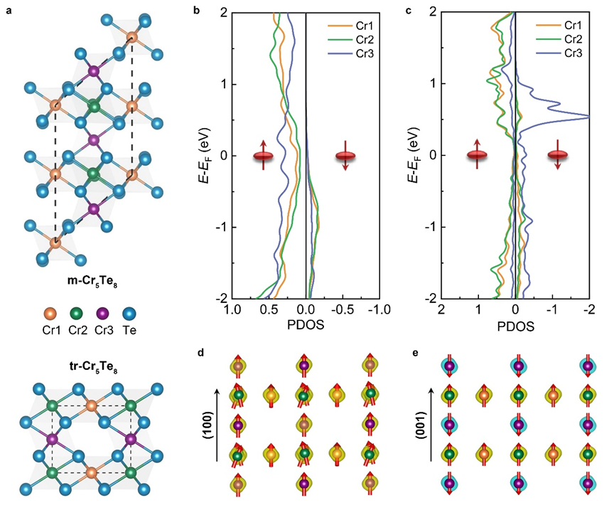 最后,研究团队基于第一性原理方法研究了Cr5Te8材料体系的基态电子结构和磁序。三方和单斜Cr5Te8同为Stoner铁磁金属体系,Stoner参数分别为1.01和1.14,单斜相具有更强的Stoner铁磁耦合特征。通过分析磁各向异性可知,两种结构易磁化方向均为面外方向。依赖于CrTe正八面体的结构畸变,单斜Cr5Te8表现出明显的非共线磁性特征(图5d-e)。该工作获得了具有巨反常霍尔角的二维磁性材料Cr5Te8,有望推动二维极限下量子反常霍尔效应的实现,对于新一代霍尔器件,尤其是量子反常霍尔器件尤为重要。
