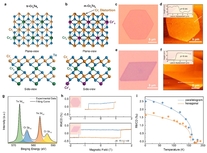 Cr5Te8相结构的可调性源于其三方相和单斜相形成能的差异。三方Cr5Te8属于P-3m1空间群,而单斜Cr5Te8属于C2/m空间群(图1a-b)。因此,CVD过程中的生长温度对于实现相变至关重要。在较高温度下,三方Cr5Te8将成为主要相,而降低温度则有更利于单斜相的形成。此外,考虑到三方相中Te浓度略高于单斜相(61.5-62.0 at. % Te vs 59.6-61.5 at. % Te),较高的温度也有利于Te前驱体的蒸发,确保足够量的Te反应并进入到Cr-Te基体中,从而获得三方相Cr5Te8纳米片。从光学和原子力显微镜图像可以看出,具有不同相结构的Cr5Te8纳米片由于不同的晶格对称性也展现出了不同的形貌特征,三方相多为六边形,单斜相则多为平行四边形(图1c-f)。XPS和RMCD等表征结果初步确认了纳米片的组分与磁性。三方和单斜Cr5Te8纳米片在低温下都展现出矩形磁滞回线,清楚地表明了其具有垂直磁各向异性的铁磁性。此外,在同等厚度下,单斜相展现出更大的矫顽力和居里温度,表明Cr5Te8晶体中的强相依赖性磁序(图1h-i)。
