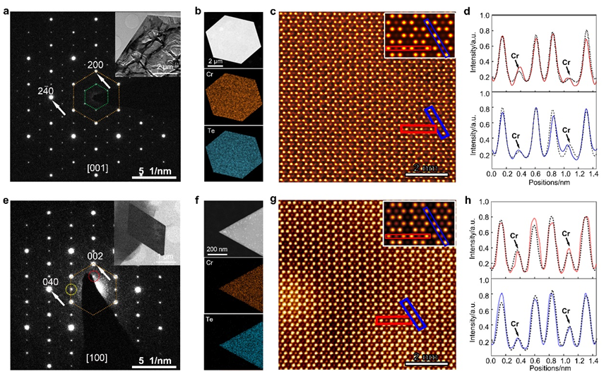 三方Cr5Te8和单斜Cr5Te8的晶体结构,相当于以CrTe2为骨架,在其层间引入1/4的Cr原子而形成的。不同之处在于,在三方相中相邻两个插层中的Cr分布完全一致,而单斜相中相邻两个插层中的Cr是交替排布的,后者在错排的同时会产生结构畸变,诱发三方相转变为单斜相(如图1a-b)。图2b和f显示不同相结构的成分分布均匀,且二者成分差别不大。为区分出两种相结构,研究团队采用选区电子衍射以及高分辨HAADF-STEM成像的方法进行了深入的研究。由于两种相结构中插层Cr分布的差异,在电子衍射中会产生不同的超点阵,根据衍射图像可以明确区分出具有三重对称的三方相Cr5Te8以及两重对称的单斜相Cr5Te8(图2a和e)。更进一步地, 高分辨HAADF-STEM成像清晰地给出了两种相结构在原子尺度上的衬度差异。不同方向的原子衬度分布(图2d和h)与结构模型中插层Cr原子的位置以及对应的QSTEM模拟结果完全吻合,从而证实了CVD方法可以实现Cr5Te8相结构的调控。