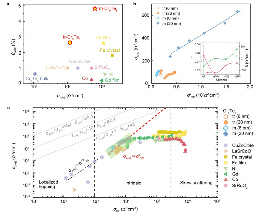 通过反常霍尔测试结果,研究团队进一步提取出了二维Cr5Te8的反常霍尔角,其中三方相的二维Cr5Te8霍尔角为2.7%,单斜相的为5%,高于传统铁磁材料,且远大于块体Cr5Te8的反常霍尔角(图4a)。通过标度关系分析二维Cr5Te8反常霍尔效应的产生机制,发现不同厚度和不同晶相Cr5Te8样品的反常霍尔电导都正比于其纵向电导的平方,表明反常霍尔效应产生机制中起主要贡献的是斜散射机制和本征机制(图4b),其中斜散射机制贡献的指数因子相比传统铁磁材料铁和镍提高了两个数量级。较高的斜散射指数因子以及反常霍尔电导与纵向电导之间二次方的标度关系使得二维Cr5Te8在合理的纵向电导范围内更容易实现较大的反常霍尔电导,比如当纵向电导率为2× 105 Ω−1 cm−1时,二维Cr5Te8就可以实现45度的反常霍尔角,而传统铁磁材料则需要大于108 Ω−1 cm−1的电导率才可获得相同的反常霍尔角(图4c)。