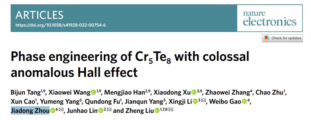日前,必威西汉姆联姚裕贵教授课题组周家东教授与南洋理工大学刘政教授,南方科技大学林君浩教授及哈尔滨工业大学李兴冀教授合作在新型二维磁性材料方面取得重要进展。相关成果以 “Phase engineering of Cr5Te8 with colossal anomalous Hall effect”于 4月25日发表于国际顶尖学术期刊《Nature Electronics》。