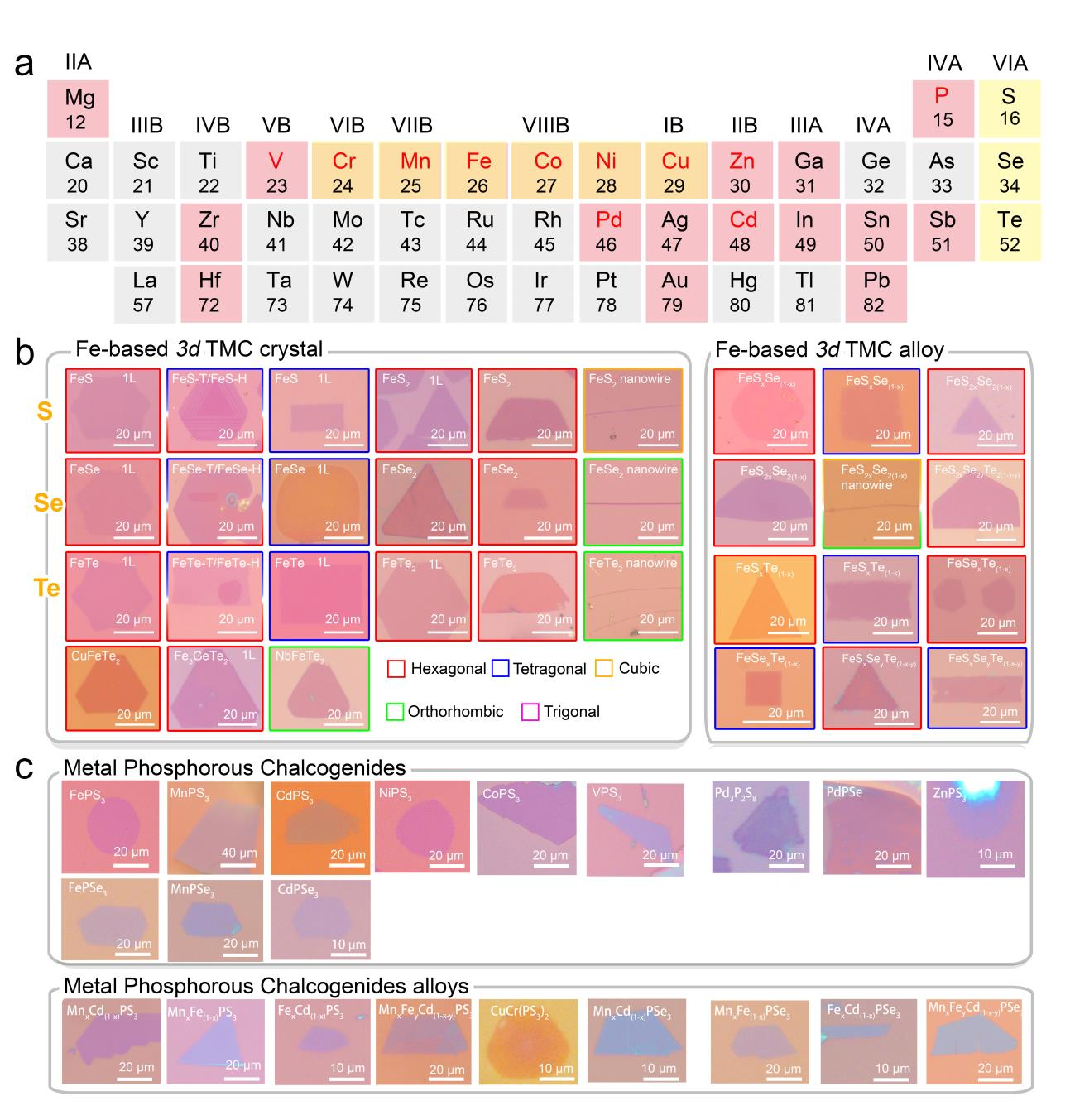 基于该机制,团队成功地合成了60多种类型的2D材料,其中TMCs 30种,TMPCs 21种;大多数材料尤其是TMPCs,从未见报道通过CVD方法合成。此外,通过扩展该方法,团队还成功合成了其它基于不同相的三元过渡金属(如Cr、Mn和Cu)硫族化合物,进一步证明了该生长方法的普适性。