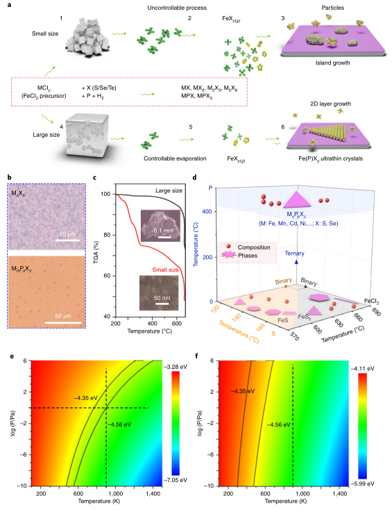 该工作不仅为原子级薄的TMCs和TMPCs的合成开辟了一条新途径,还展示了一种新颖的生长机制,对全面理解二维材料的生长机制具有重要意义。基于所提出的策略制备的具有可控相、组成和异质结构的晶体将为探索包括二维相变、二维铁磁、二维超导、马约拉纳束缚态和多体激子等在内的物理现象提供可能性。