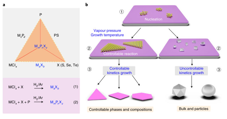 鉴于以上问题,必威西汉姆联官网周家东、王业亮、姚裕贵教授团队和南洋理工大学刘政教授等首次联合提出了竞争反应动力学的生长机制,通过控制温度和蒸气压,实现了对化学气相沉积过程单一相的成核和生长速率的控制,进而实现了67种包括不同组分/不同相的(MX、MX2、MPX和MPX3)TMCs和TMPCs及其合金与异质结的可控制备。重要的是,Fe基组成和相工程的实现为研究Fe基自旋电子学,以及基于Fe基超导体的马约拉纳零能模等开辟了新的可能。磷硫化合物的首次CVD直接制备为进一步研究其反铁磁特性及器件提供了材料基础。这是继2018年开发的二维材料库的普适性生长方法(Nature 556, 355 (2018))后的又一普适性制备策略。相关成果以 “Composition and phase engineering of metal chalcogenides and phosphorous chalcogenides”于 6月23日发表于国际顶尖学术期刊《Nature Materials》。