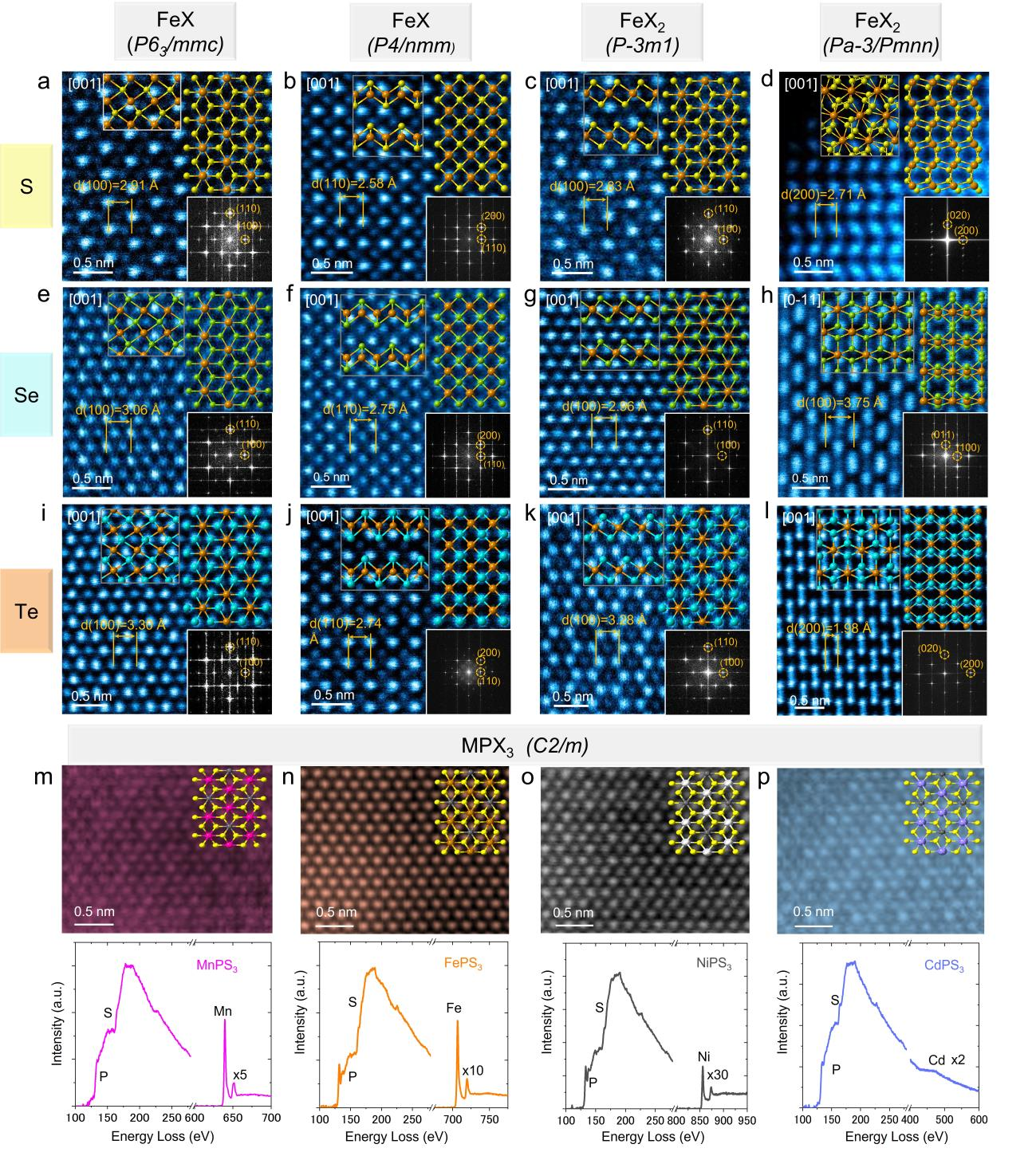 根据实验和模拟Z-contrast STEM图像、EDS mapping和EELS结果综合分析,制备所得的大部分铁基硫族化合物和TMPCs属于5个不同的空间点群,可划分为5类:(1)P63/mmc(非层状六方/三角形FeX);(2) P4/nmm(层状四方FeX);(3) P3 ̅m1(六边形/三角形/梯形的层状FeX2);(4) Pa3 ̅(非层状FeS2纳米线)和Pmnn(非层状FeS2和FeTe2纳米线);(5) C2/m (MPX3, M = Mg, V, Cr, Mn, Fe, Co, Ni, Ag, Cd或Zn)。以MPX3为例,从结构上看,单层MPX3的元胞由一个哑铃状P2X6和两个M原子组成,形成每个M原子与6个X原子配位,每个P原子与1个P和3个X原子配位的蜂窝状结构。当沿垂直方向堆叠时,MPX3层之间的面间位移打破了三重反转旋转对称性,产生了一个属于C2/m空间群的单斜晶格。STEM-ADF图像沿[103]带轴呈现六重对称晶格,与多层MPX3的六方单层和单斜堆叠特征一致。此外,通过相应样品Mn L2,3边,Fe L2,3边,Ni L2,3边和Cd M4,5边的EELS光谱确定了MPX3的元素组成。