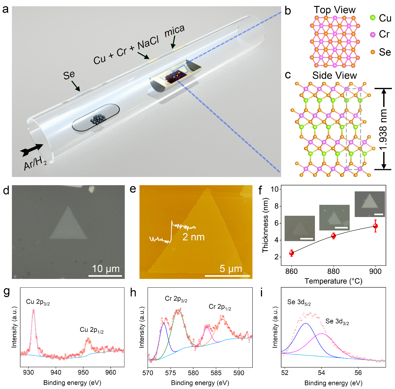 本文采用CVD法合成了CuCrSe2纳米片,生长过程如图1a所示。CuCrSe2原子结构如图1b和1c所示。CuCrSe2晶体属于R3m空间群,晶格常数a=b=0.36768nm,c=1.938nm。CuCrSe2可认为是准2D晶体结构,其中Cu原子插层进入到以3R顺序堆叠的CrSe2层间,并占据四面体配位。Se的反应温度、Ar气流速和生长温度都对CuCrSe2晶体生长存在影响。如图1f所示,通过对生长温度进行调控,从而可以调控CuCrSe2纳米片的厚度。此外,如图1g-i所示,利用X射线光电子能谱(XPS)对CuCrSe2纳米片中的Cu、Cr和Se元素价态进行研究,各元素价态与之前文献报道一致。综上所述,我们合成出高质量的CuCrSe2晶体材料。