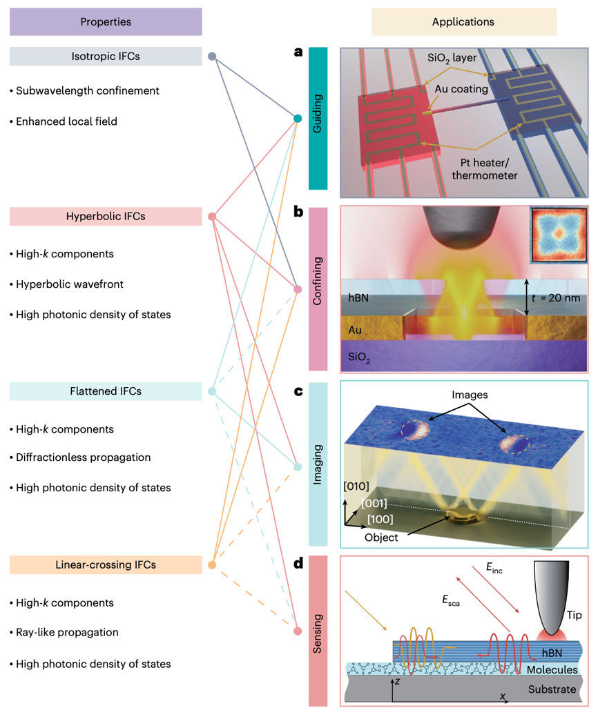 基于上述新奇光学现象与调控手段,论文展望了极化激元在多个领域的变革性应用潜力,例如在纳米波导和能量传输方面,极化激元渠道化传播为实现低损耗片上光互联和纳米尺度高效热管理提供了新途径。再比如,在光场局域方面,双曲极化激元高动量模式能将光场压缩至极小体积,极大增强光与物质相互作用,为高灵敏度红外分子传感、探测和强耦合研究提供了理想平台。尽管前景广阔,论文也指出极化激元领域在多功能纳米光学器件设计(如路由器、逻辑门、偏振器等)、克服高传播损耗、以及利用人工智能进行逆向设计等方面仍面临严峻挑战,是未来极化激元器件走向实际应用必须攻克的难题。