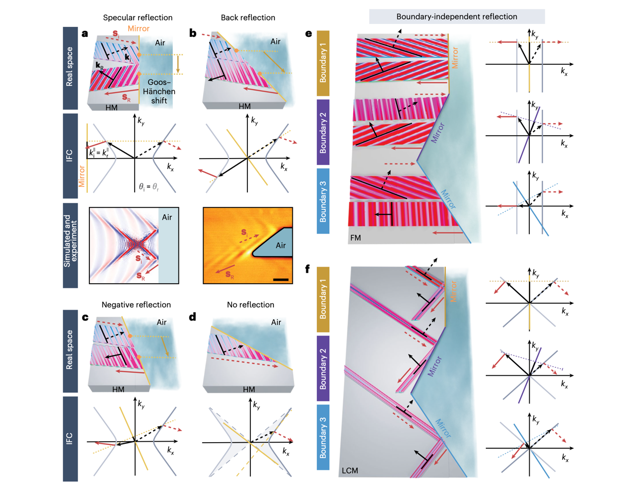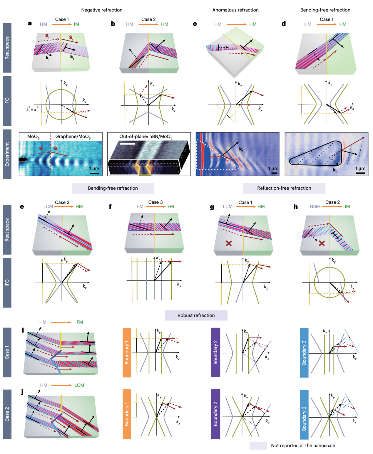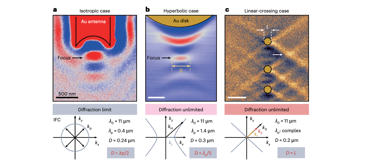 研究表明各向异性材料中极化激元的折射与反射行为异于传统认知,挑战了传统的斯涅尔折射定律和反射定律。例如“负折射”现象(即折射能流与入射能流位于界面法线的同一侧)、“无弯曲折射”现象(极化激元波穿越界面时方向几乎不变)等。在反射方面,除了常规的镜面反射,在双曲材料中还存在“负反射”和特定入射角下的“无反射”现象。在干涉聚焦方面,线性色散极化激元可实现中红外光场的纳米聚焦,突破衍射极限。产生这些现象的根本原因在于各向异性材料中极化激元波矢随晶体方向变化,且波矢与波印廷矢量(能流方向)非共线。