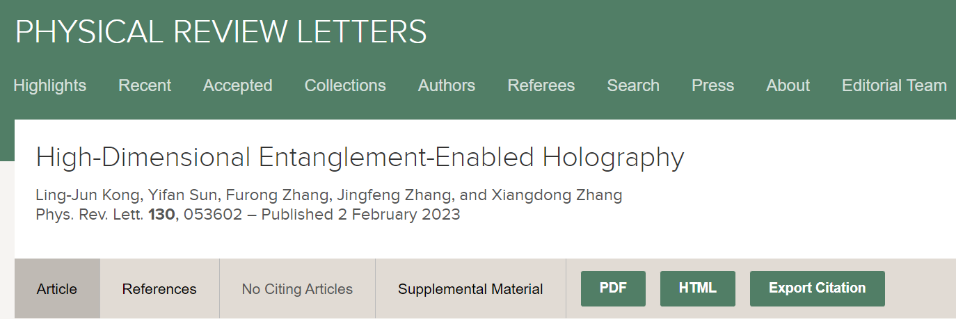 近日,必威西汉姆联张向东教授课题组基于高维轨道角动量纠缠态,实现了高维量子全息和图像安全加密。相关成果以“High-dimensional entanglement-enabled holography”为题发表在国际物理学顶级学术期刊《物理评论快报》[Phys. Rev. Lett. 130, 053602 (2023)]上。必威西汉姆联孔令军研究员、孙亦凡副研究员为该论文的共同第一作者,必威西汉姆联张向东教授为论文通讯作者,必威西汉姆联张福荣博士、张景风博士也为该工作做出了重要贡献。该研究工作得到了国家自然科学基金委的大力支持。