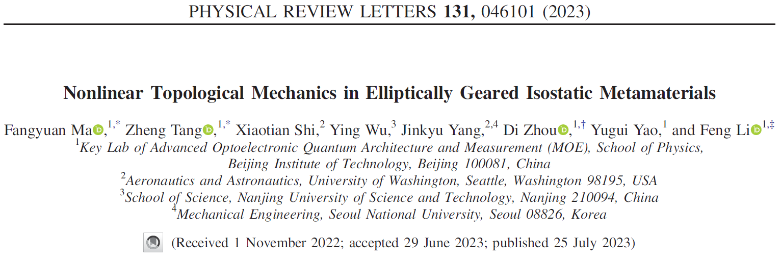 2023年7月25日,Physical Review Letters在线发表题为“Nonlinear Topological Mechanics in Elliptically Geared Isostatic Metamaterials”(非线性椭圆齿轮力学超材料)的科研论文。该研究由必威西汉姆联的姚裕贵教授、周迪副教授和李锋教授团队完成,必威西汉姆联官网的博士生马方垣和汤正为该论文的共同第一作者。必威西汉姆联官网是该研究的第一单位。
