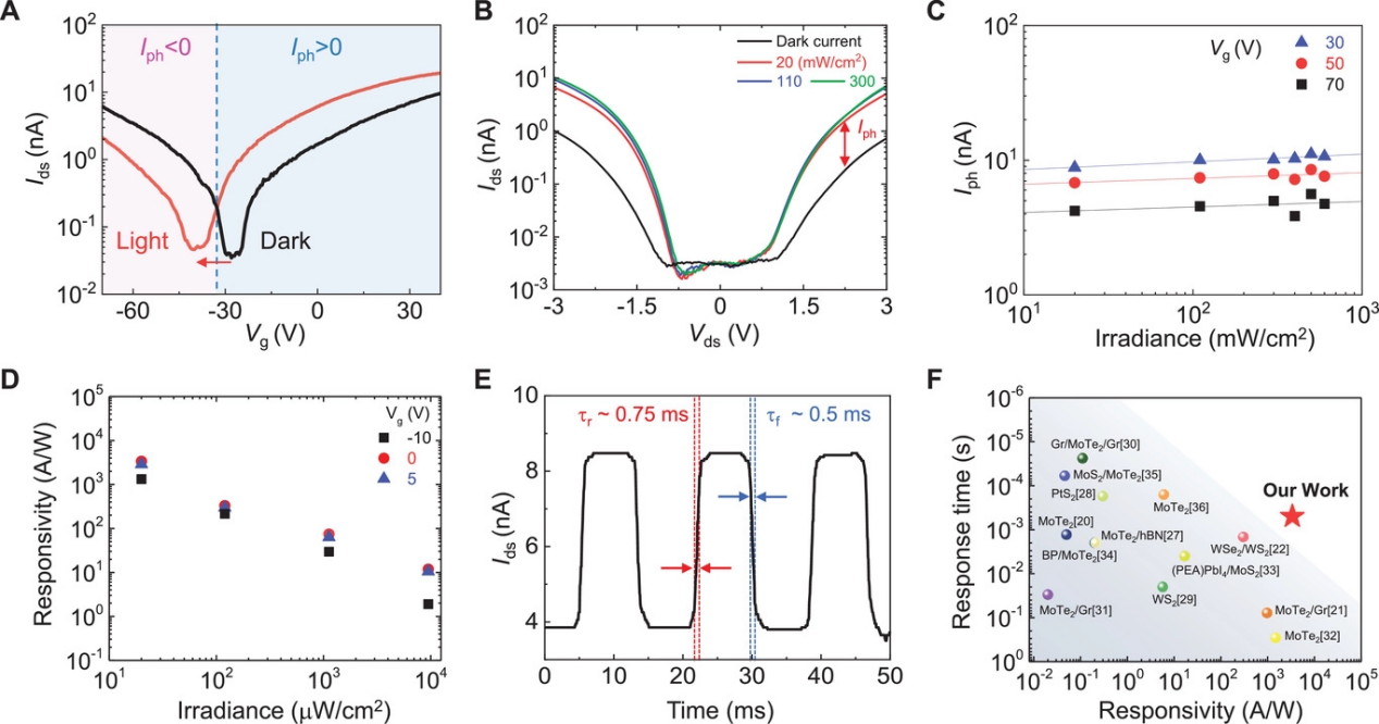 图2. 隧穿光电晶体管性能。(A)黑暗条件和光照条件下的转移曲线。(B)在黑暗条件和三种不同功率激光照射下,Ids与Vds的关系。(C)在Vg=30、50和70V且Vds=3V时,光照下功率相关的光电流。(D)在三个不同栅极电压(λ=638nm)下,响应率与光功率密度的关系。(E)时域中的光电晶体管开关操作。(F)光电晶体管的响应时间和响应率的比较。