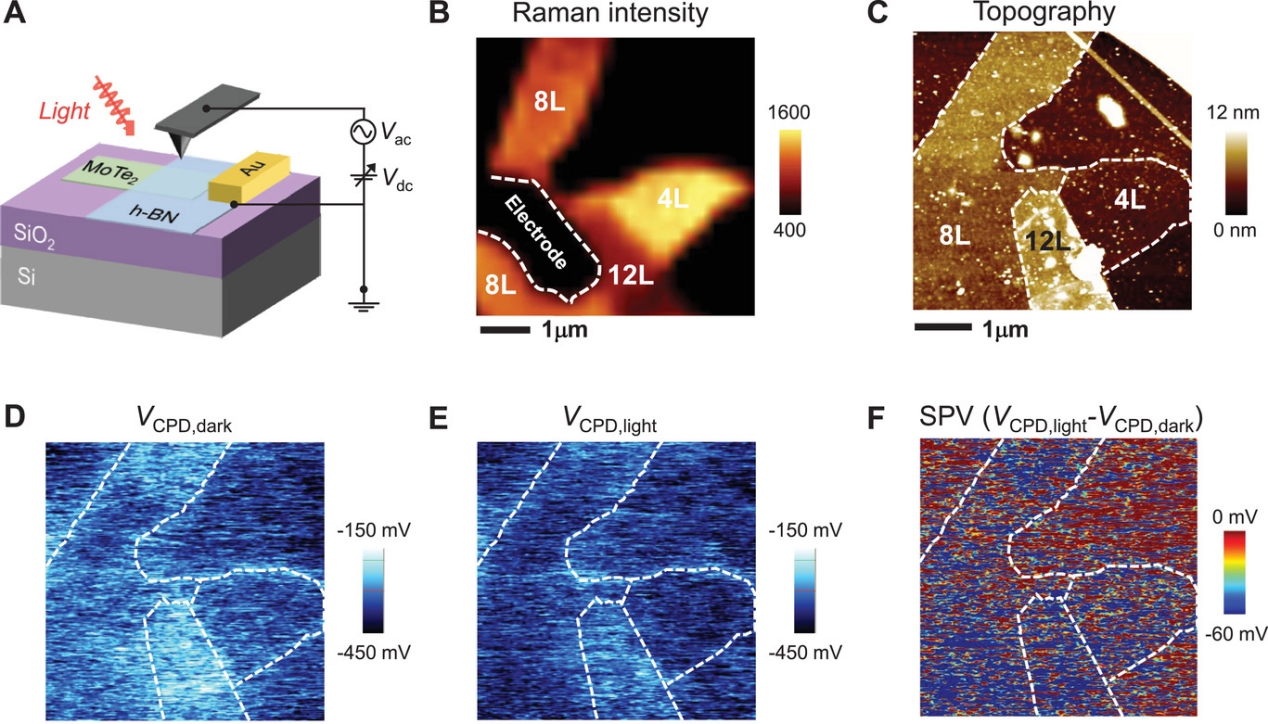 图3. 表面光电压表征。(A)用于研究接触电位差(VCPD)的KPFM基测量装置的示意图。(B)拉曼强度成像。(C)形貌图像。(D&E)在黑暗条件和λ=635 nm光照下的接触电位差(VCPD)成像。(F)SPV成像,由VCPD在黑暗条件下和光照条件下的差异定义。