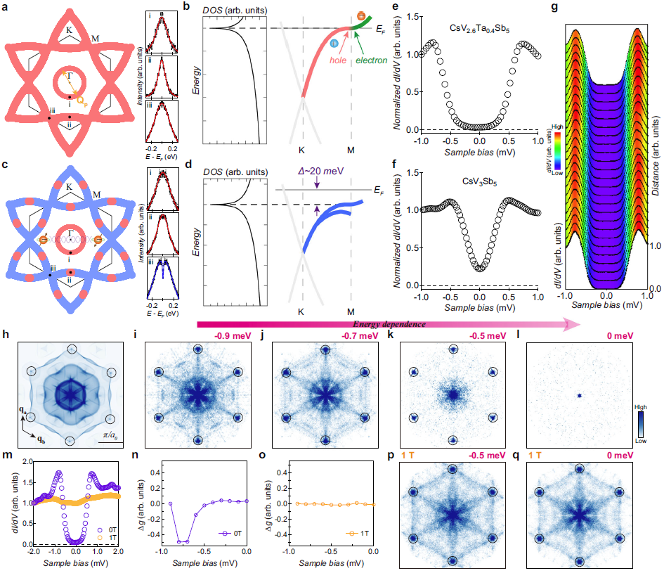 在关联材料体系中,VHS为理解电子态密度发散提供了一个范例。在VHS处,电子库仑力占主导,这反过来又会导致系统中多重不平衡态的出现,包括电荷密度波(CDW)、自旋密度波(SDW)、d波超导体等。在该类超导体中,一个理想的范霍夫情景主要通过两种途径来实现。一种是增加态密度,通过常规或非常规的电子-玻色子配对来完成库珀配对;另一种是由VHS处共存的电子和空穴之间的库仑力驱动形成非常规的电子配对。这对VHS的能级位置要求严格,使其在真实材料中的实现具有挑战性。最近,AV3Sb5 笼目结构超导材料系列得到了广泛关注。其电子结构中存在着多个VHS,同时该材料中存在二维VHS的两种主要的不平衡态——CDW和超导,这为我们探索范霍夫情景提供了良好的研究平台。虽然理论预测得到了良好的结果,但是依然缺少实验证据来表明VHS的作用。