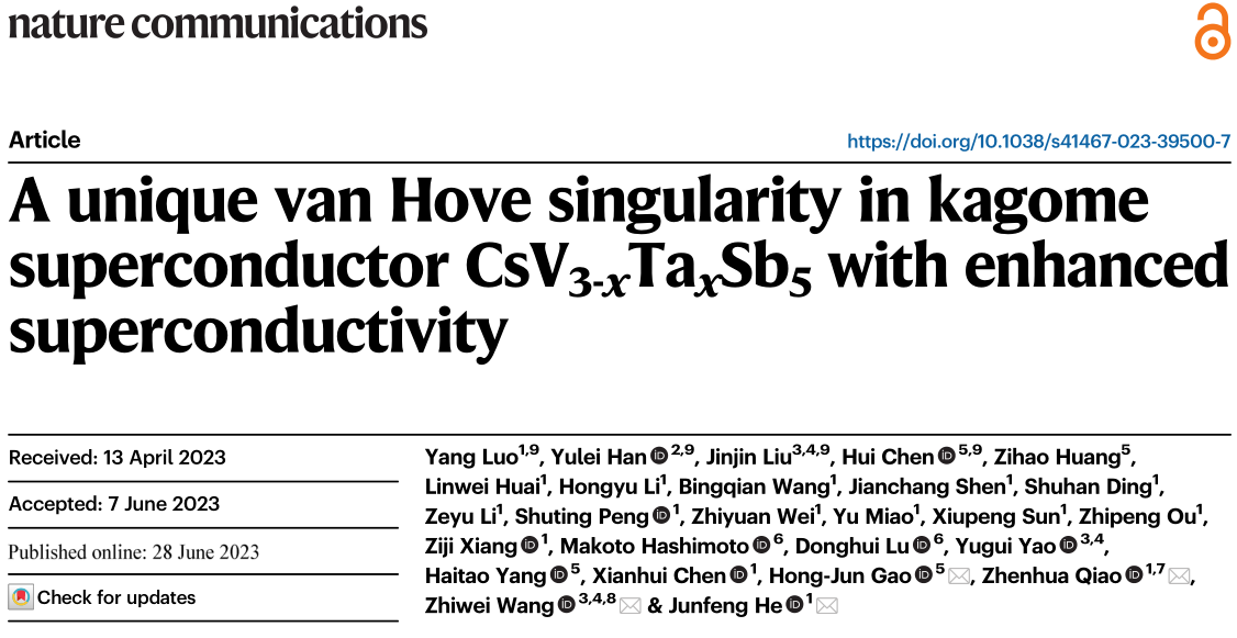 近日,必威西汉姆联王秩伟研究员、姚裕贵教授团队,与中国科学技术大学何俊峰教授、乔振华教授,以及中科院物理研究所高鸿钧院士等人合作在《自然通讯》(Nature Communications)发表了对笼目结构超导材料CsV3-xTaxSb5中范霍夫奇点(von Hove Singularity, VHS)的研究。