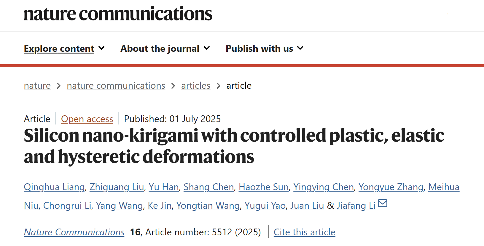 Qinghua Liang#, Zhiguang Liu#,Yu Han#, Shang Chen, Haozhe Sun, Yingying Chen, Yongyue Zhang, Meihua Niu, Chongrui Li, Yang Wang, Ke Jin, Yongtian Wang, Yugui Yao1, Juan Liu and Jiafang Li*, “Silicon nano-kirigami with controlled plastic, elastic and hysteretic deformations”, Nat. Commun.16, 5512 (2025).