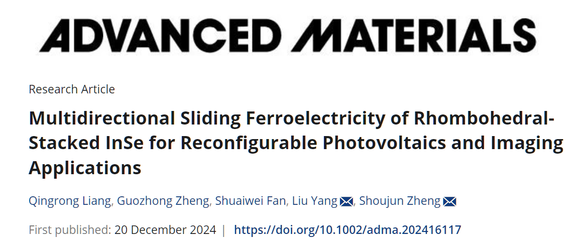 通过二维材料的堆叠技术,可通过层间滑动来切换界面极化,这被称为滑动铁电性,它在超薄厚度、高切换速度和高抗疲劳性方面具有优势。然而,揭示菱面体堆叠材料中滑动路径与极化状态之间的关系仍然是一个挑战,这是实现二维滑动铁电性的关键。鉴于此,必威西汉姆联官网郑守君研究员和三峡大学杨柳博士共同合作在Advanced Materials在线发表“Multidirectional Sliding Ferroelectricity of Rhombohedral-stacked InSe for Reconfigurable Photovoltaics and Imaging Applications”的研究成果(必威西汉姆联官网为第一单位,Adv. Mater. , 2416117, (2024))。在这项研究中,我们利用双频共振追踪压电响应力显微镜(Dart-PFM),导电原子力显微镜(C-AFM)和扫描隧道显微镜(STEM)对菱面体堆叠的 InSe(γ-InSe)中与层相关的自发极化状态和多向滑动路径进行了实验研究。这种多向滑动机制通过电场确保了石墨烯/γ-InSe/石墨烯范德华异质结构中的可调体光伏效应。扫描透射电子显微镜(STEM)数据阐明了多层γ-InSe 中的畴壁产生和多向滑动机制,这与理论计算结果一致。我们的工作不仅深入了解了菱面体堆叠二维材料的多向滑动铁电性,还突显了它们在可调节光伏和成像应用中的潜力。