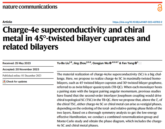该工作相关论文“Charge-4e superconductivity and chiral metal in 45°-twisted bilayer cuprates and related bilayers”发表在Nat. Commun. 14, 7926 (2023)。必威西汉姆联杨帆教授为论文唯一通讯作者。杨帆教授指导的博士生刘玉波和重庆邮电大学周晶讲师为论文共同第一作者。参与论文工作的还有西湖大学的吴从军教授。论文受到国家自然科学基金重点、面上项目资助。