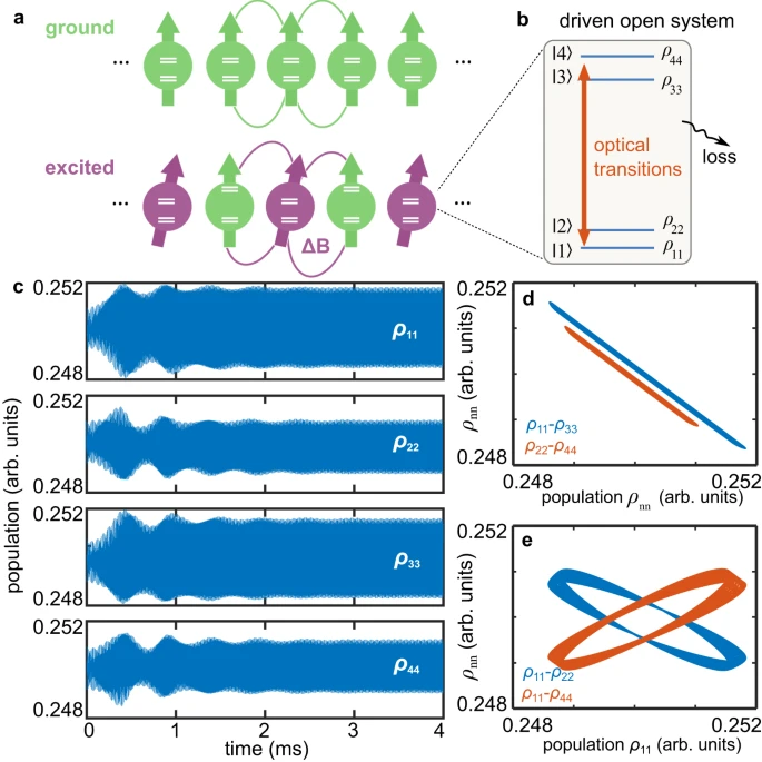 图1(a)所示为我们研究的多体系统示意图。原子在激光驱动下会发生跃迁,而跃迁到激发态的原子会通过磁偶极相互作用改变相邻原子所处的磁场环境,从而引起相邻原子频率的改变。图1(b)所示为原子的能级结构图,其中光学基态和激发态都分别有两个自旋能级,从而构成了一个四能级系统。图1(c)的数值计算结果表明,即使在连续光的作用下,系统的布局数分布是随着时间不停振荡的,永远都不会达到一个稳定的状态。图1(d)和(e)进一步展现了时间平移对称性破缺系统中的极限环动力学过程。这种时间平移对称性破缺是一种特殊的物质状态,是在没有周期性力或腔体的情况下自发形成的。