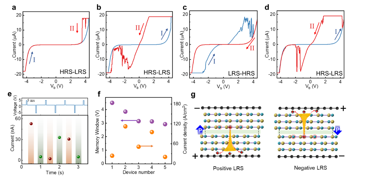 图3展示了滑移忆阻器中的记忆窗口。图a-d展示了PS-BN中HRS和LRS之间的切换,显示了可逆的大记忆窗口。图c展示了器件可以在电场的同一方向上从LRS切换到HRS,这与基于金属电极的忆阻器不同。图e展示了在5ms内分别用 5V和 -5V的脉冲电压对滑移忆阻器进行编程和擦除。图f展示了几个器件的记忆窗口大小和电流密度的汇总。图g展示了带正电荷的硼离子在两个界面极化运动时形成导电丝的示意图。