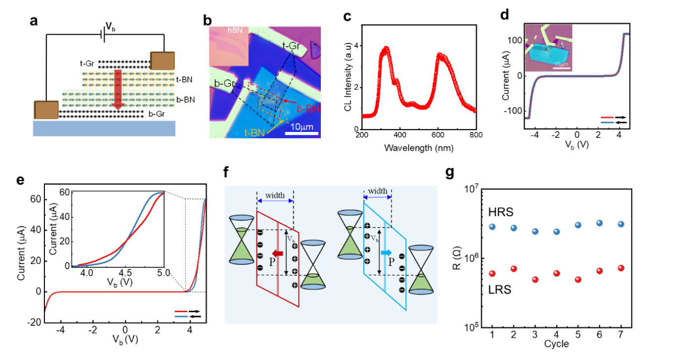 图 2展示了滑移忆阻器的隧穿电流特性。图a展示了由石墨烯/PS-BN/石墨烯结构组成的滑移忆阻器示意图。图b展示了滑移忆阻器的光学照片。图c展示了h-BN 的阴极荧光光谱,在 350 nm和 630 nm波长附近显示出多个阴极荧光峰。图d展示了石墨烯/h-BN/石墨烯隧穿器件的 I-V 曲线,没有滞后现象。图e展示了滑移忆阻器的 I-V 曲线,显示在4 V左右存在稳定的回滞。图f展示了具有两种极化态 PS-BN 的滑移忆阻器能带图,显示了可调的势垒高度和宽度。图g展示了在写入电压为5 V和擦除电压为-5 V时,滑移忆阻器的耐久性。