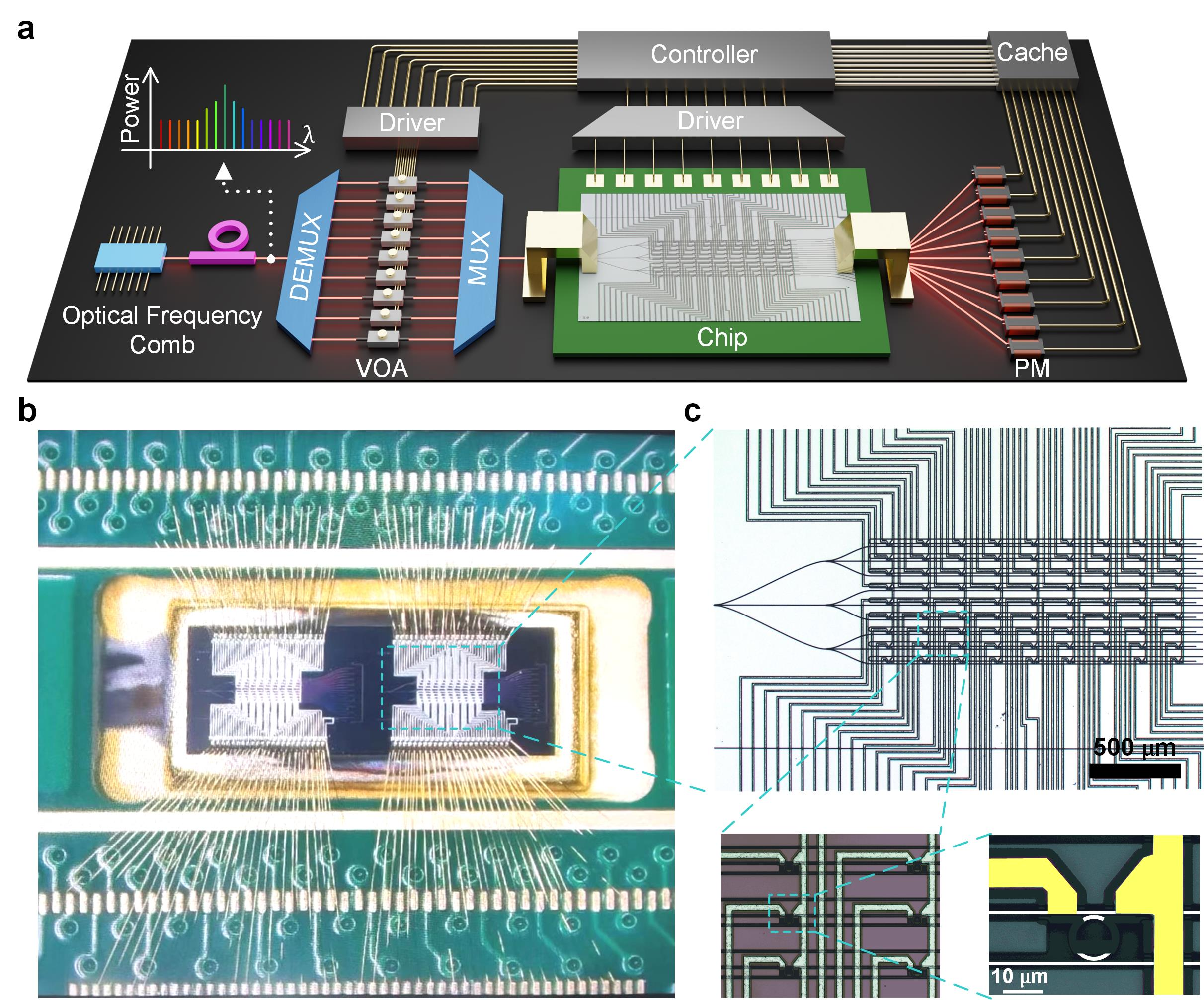 图1. (a) Kerr 光频梳驱动的光子计算系统示意图;(b) 制备完成的光子芯片在印刷电路板(PCB)上的实物封装图;(c) 芯片内部微环阵列及金属布线的局部放大图