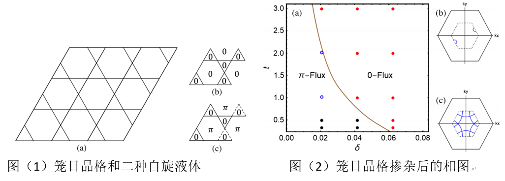 已故的凝聚态物理学创始人之一、诺贝尔物理奖获得者P. W. Anderson曾有一个非常著名的理论:当一个量子自旋液体态被掺杂入自由载流子之后,将变成为非常规超导。量子自旋液体是一类特殊的自旋体系,这些体系当温度一直降到零温都不进入磁有序和其它自发对称破缺相,从而超出Landau关于物态的一般框架。Anderson指出在这类态中,自旋相反的电子之间天然已经形成了配对,只是由于缺乏自由载流子,从而为莫特绝缘体。此时,任意的掺杂将导致超导态的出现。Anderson的理论虽然深刻而合理,但长久以来未能在一个真实的实际材料或者简单的模型体系中实现。1973年和1987年,Anderson分别提出三角晶格和正方晶格海森伯模型的自旋液体基态;其中后者被认为掺杂后导致高温超导。后来,该二模型体系均被多种数值计算结果判定为磁有序态,从而无法实现自旋液体。然而,近年来涌现出一个倍受关注的新自旋体系,ZnCu3(OH)6Cl2。该体系具有Kagome晶格(也称笼目晶格),如下图(1)所示。各方面实验显示该体系可能为自旋液体。理论上,国际多个研究组的不同数值结果也支持量子自旋液体基态。其中可能性最大的态可以用图(1)中的投影π-通量态近似描述。然而,对于该体系在掺杂后会形成何种超导态,此前尚未有系统深入的研究。