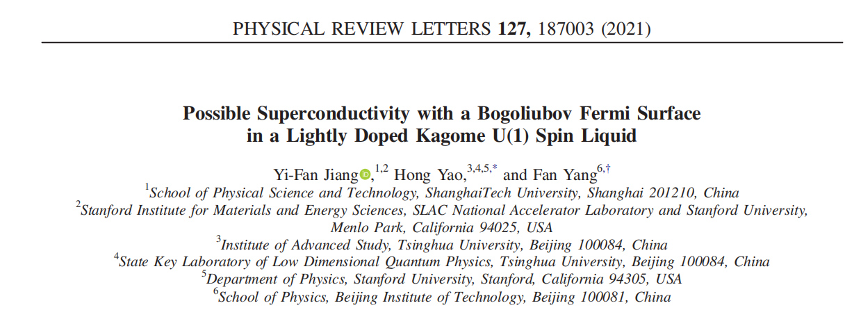 该论文工作发表在物理学顶尖期刊 Phys. Rev. Lett. 127,187003 (2021)。上海科技大学蒋易凡副教授为论文第一作者。杨帆教授和清华大学高等研究院姚宏教授为共同通讯作者。论文受到国家自然科学基金资助。