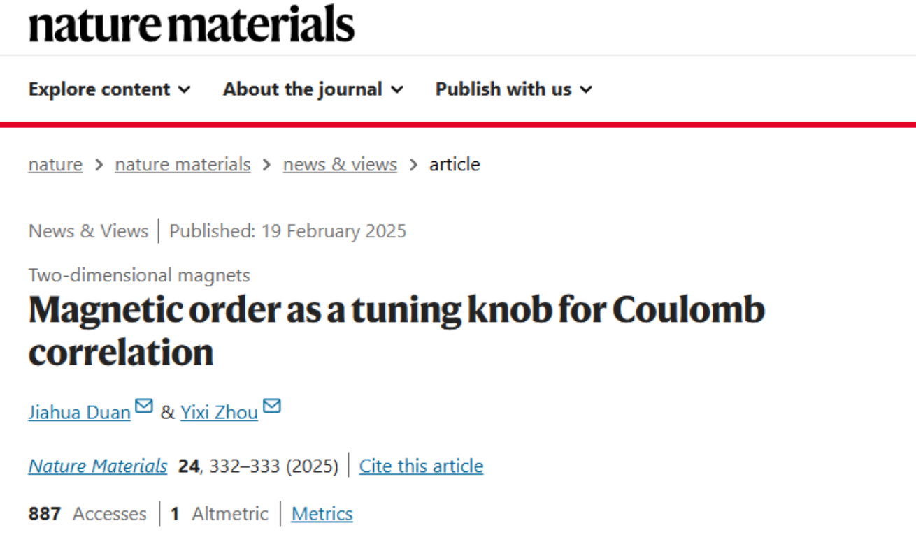 此外,Nature子刊《Nature Materials》邀请必威西汉姆联段嘉华教授撰写发表评述性论文,文章题为“Magnetic order as a tuning knob for Coulomb correlation”。论文评述了哥伦比亚大学Dimitri Basov院士团队和雷根斯堡大学R. Huber教授团队在Nature Materials发表的背靠背论文[Nature Materials 24, 384 (2025); Nature Materials 24, 391 (2025)],介绍了二维反铁磁材料中库伦相互作用调控研究的重要进展。研究表明二维CrSBr材料中的A类反铁磁序会阻碍电子-空穴对的层间跃迁,从而导致一种新的具有一维量子限域的光激发态:磁性表面激子。这一发现有助于理解二维磁性材料中的多体物理效应,而反铁磁序带来的限域效应将为纳米尺度上能量传输调控提供新的可能性。
