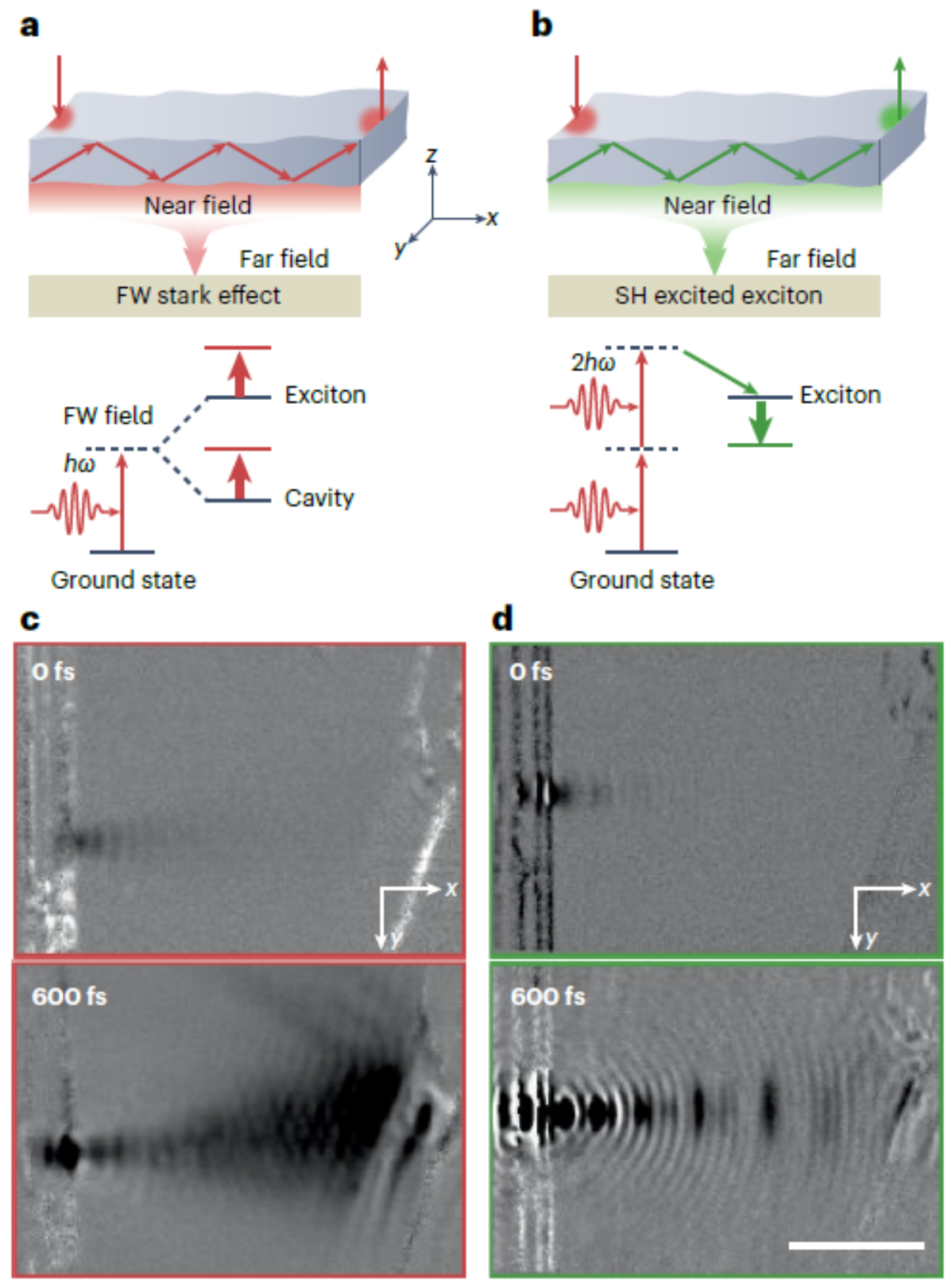 图1展示了远场频闪散射显微技术的成像原理。图a-b表明基础光场和二次谐波光场分别会引起光谱的蓝移和红移,从而可以基于远场光学测量到波导模式的时空动力学过程。图c-d分别是基础光场和二次谐波光场传播过程的实空间成像。
