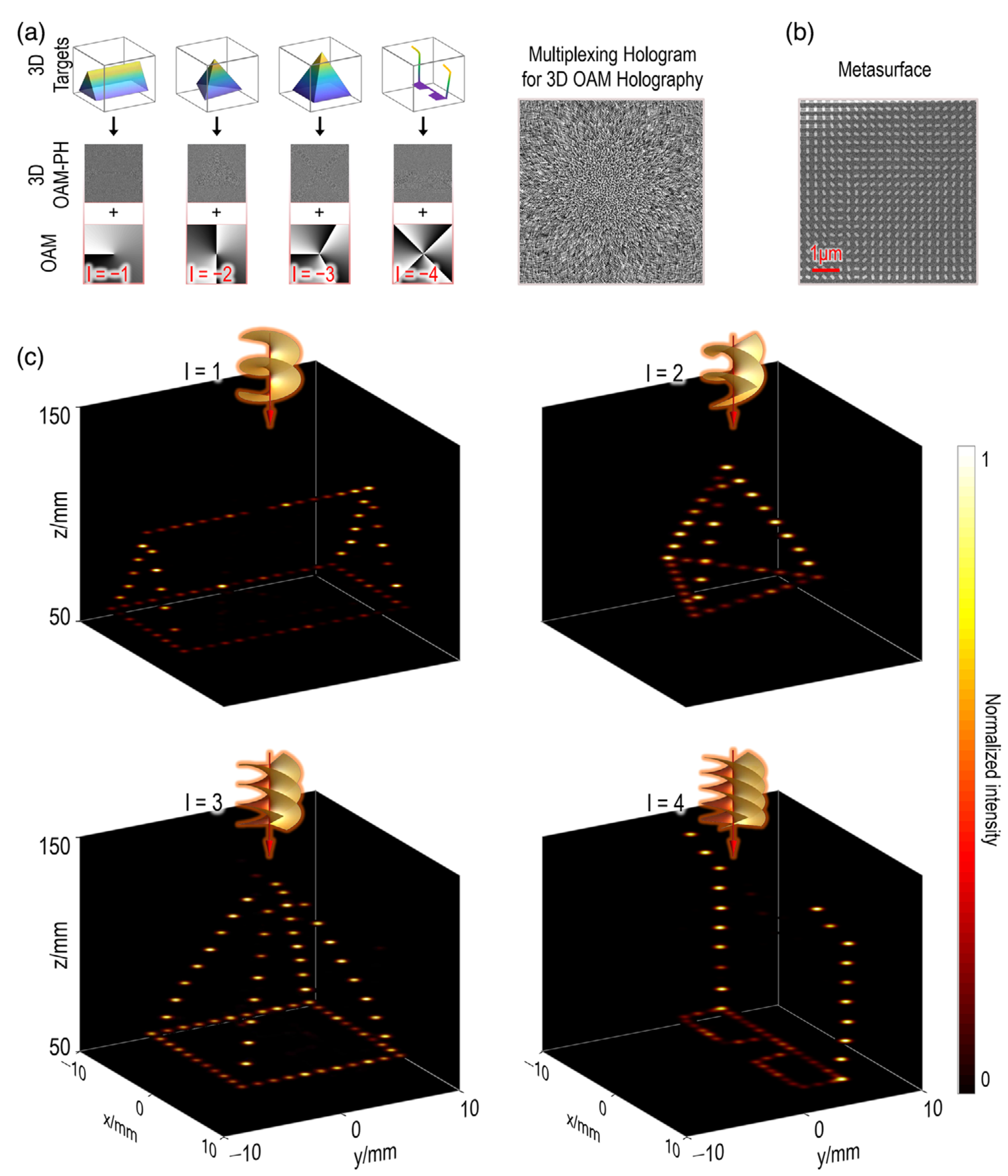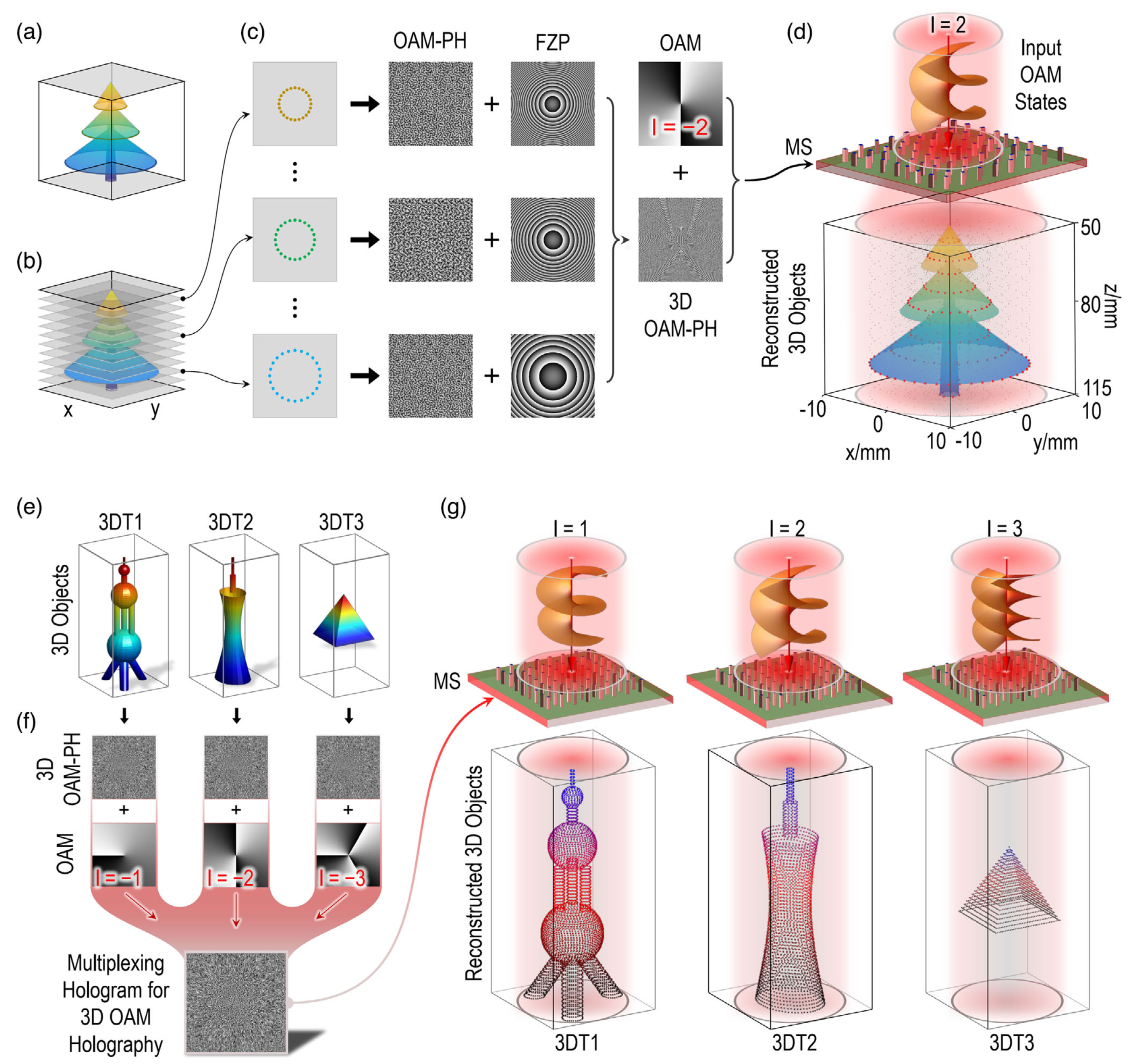 图1. 3D OAM全息和3D OAM复用全息原理图。
