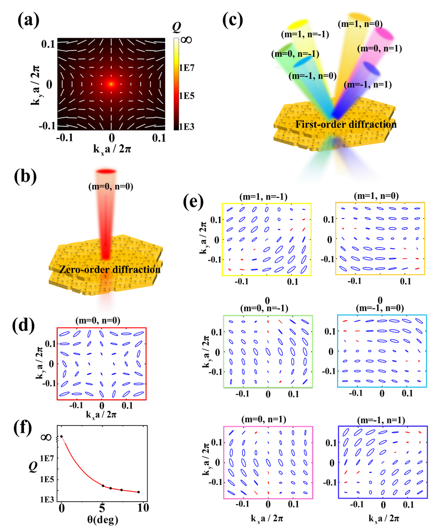 在旋转双层光子晶体板后,新形成的moiré原胞的周期显著增大。在这种情况下,除了零阶衍射通道外,moiré光子态还会存在其它高阶衍射通道,如图2(b)和图2(c)所示。为了分析不同衍射通道的远场辐射特性,研究人员计算了零阶和一阶衍射通道的远场偏振态,如图2(d)和图2(c)所示。从图中可以看出,由于上下对称性的破缺,moiré光子晶体的零阶远场偏振态由线偏振态变为椭圆偏振态。此外,零阶衍射通道Γ点仍对应远场偏振奇点。但是对于其它的一阶衍射通道,Γ点存在形式不同的远场偏振态。上述结果说明moiré布里渊区中心(Γ点)的本征模式可以与光子连续能谱发生耦合,形成具有有限品质因子的泄漏光子态。