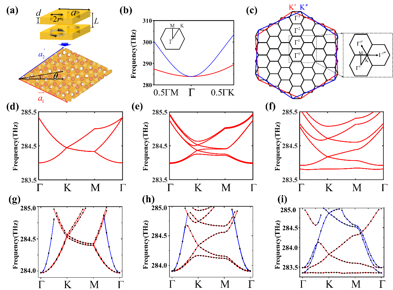 将上层光子晶体板旋转角度θ,可以实现moiré光子晶体板结构,如图1(a)的下插图所示。旋转使得双层光子晶体板的平移对称性发生了变化,导致相应的布里渊区也发生了改变,如图1(c)所示。其中红色和蓝色的大六边形分别对应顶层和底层光子晶体板的第一布里渊区。 K’ 和 K’’点用以标记上下两层光子晶体板布里渊区的等效谷点。黑色小六边形表示的是moiré光子晶体板的布里渊区。需要强调的是,由于布里渊区的能带折叠效应,除了第一moiré布里渊区的Γ点以外,高阶moiré布里渊区的每个Γ点也存在着具有二次色散的低频光子能带。