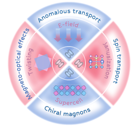 为了应对这些问题,科学家们正在探索一种能够结合铁磁体与反铁磁体优势的新型磁性材料——交错磁体。交错磁体具有类似反铁磁体的补偿反平行磁序,但其自旋相反的子晶格通过实空间的旋转变换相互关联。其能带结构破坏了时间反演对称性,呈现出非相对论性自旋劈裂的特征,进而表现出如铁磁体中的反常霍尔效应、反常能斯特效应和磁光效应等输运性质。