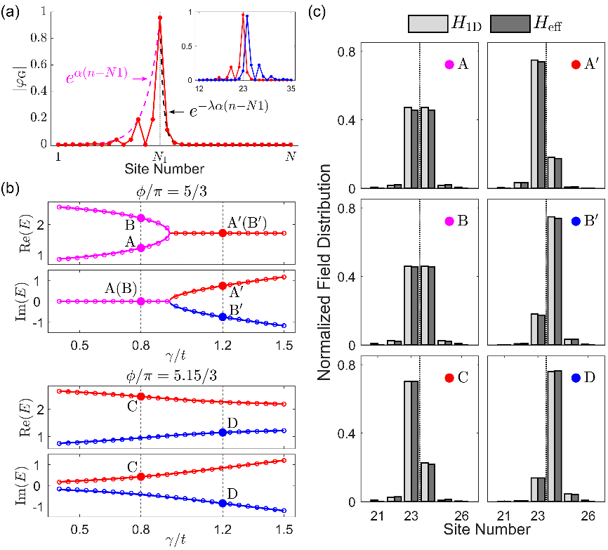图1 (a)通过引入参数拟合有效哈密顿量中的耦合项。(b),(c) 分别由H_1D与H_eff得出的模式频率与模式分布的比较。