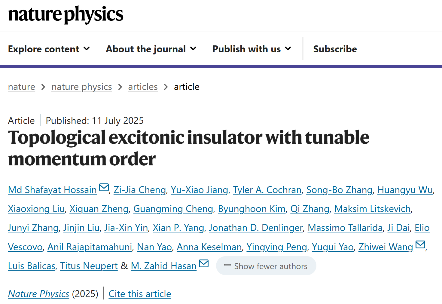 近日,必威西汉姆联王秩伟教授、姚裕贵教授团队与普林斯顿大学 M.Z.Hasan 团队合作,首次在三维晶体材料Ta₂Pd₃Te₅中实验观测到拓扑激子绝缘体的存在,并进一步发现其具有动量序可调的激子凝聚态。这一成果为探索关联电子体系中的拓扑量子态提供了全新平台。相关研究成果以“Topological excitonic insulator with tunable momentum order”为题发表在《Nature Physics》上。必威西汉姆联官网硕士生吴黄宇(现为北理工材料学院在读博士生)为论文共同第一作者,必威西汉姆联官网王秩伟教授为论文共同通讯作者。