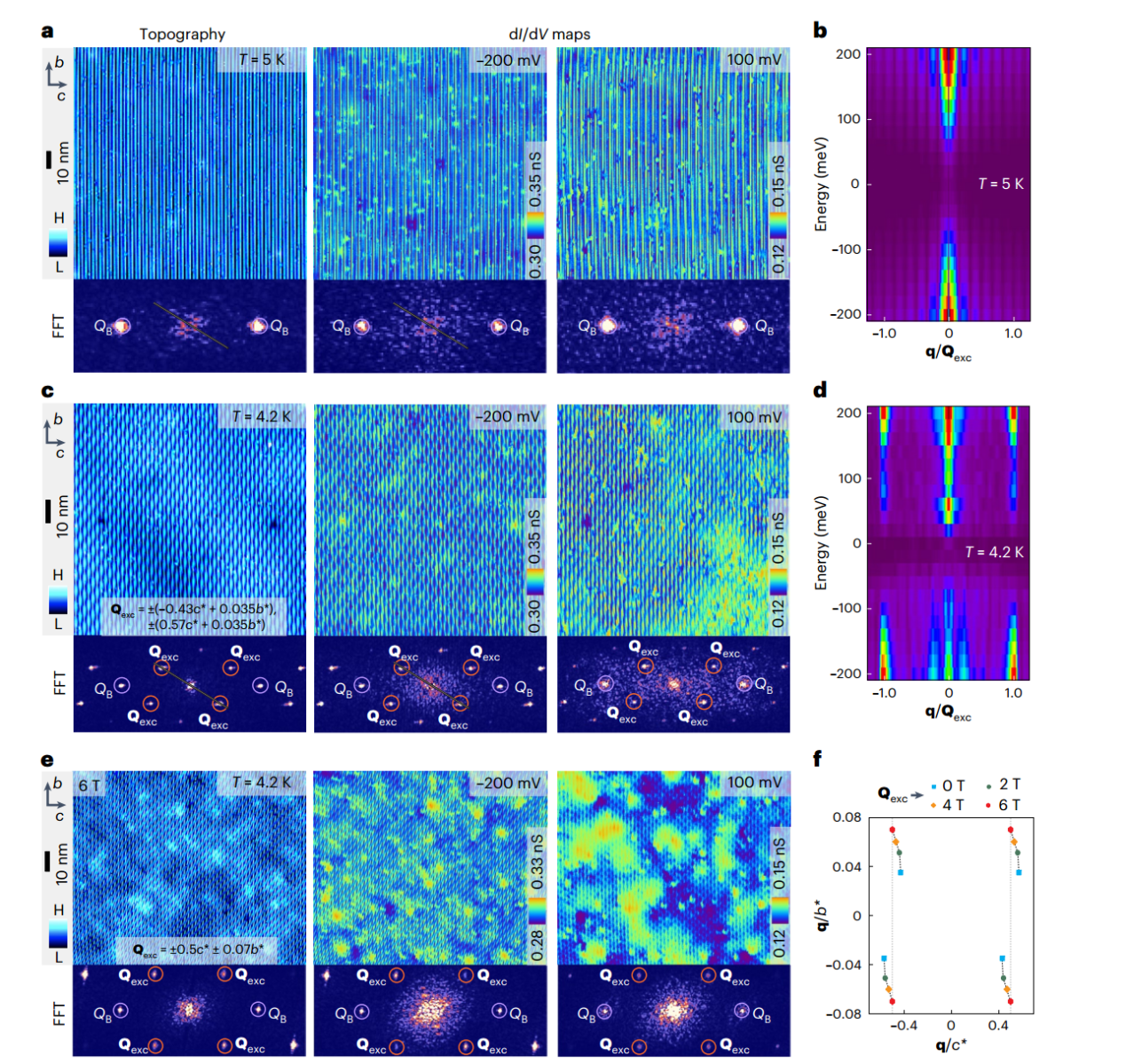 在本工作中,研究团队首先制备了高质量的层状材料Ta₂Pd₃Te₅单晶,首次观测到双重激子凝聚相:在100 K时由半金属态进入零动量激子凝聚态,4.2 K时进一步发生有限动量二次激子凝聚。团队通过极化角分辨光电子能谱测试发现,低温下电子能带发生轨道杂化,镜面对称性破缺,证实激子凝聚驱动了拓扑相变。同时,扫描隧道谱观测到体绝缘能隙,与理论模型预言的拓扑边缘态高度吻合。更令人惊奇的是,在外加磁场调控下,体系展现出动量序的可调性,为研究拓扑相变临界行为与对称性调控提供了实验窗口。