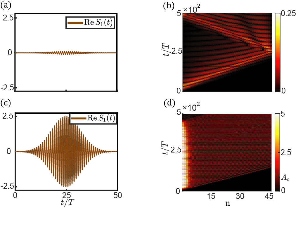 图1:小振幅拓扑、大振幅平庸的非线性系统。(a, b) 小振幅激励信号下,系统表现出拓扑边缘态响应。(c, d) 大振幅激励信号下,系统表现出体模响应。
