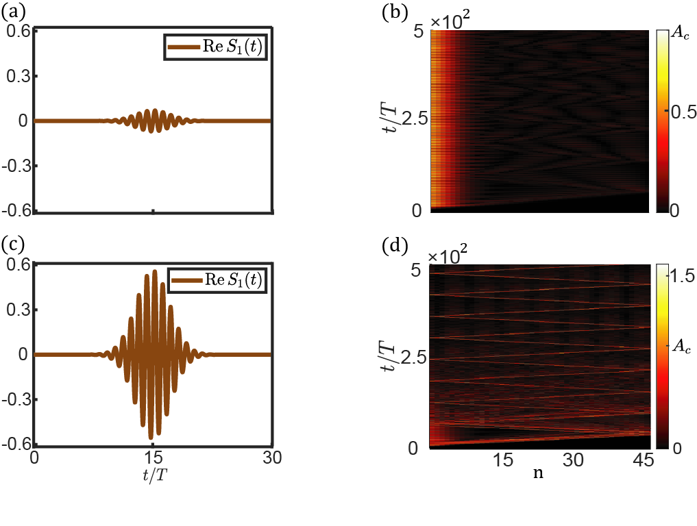 图2:小振幅平庸、大振幅拓扑的非线性系统。(a, b) 小振幅激励信号下,系统表现出体模响应。(c, d) 大振幅激励信号下,系统表现出拓扑边缘态响应。