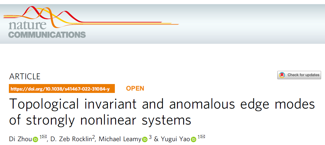 近日,必威西汉姆联姚裕贵教授、周迪研究员团队,在《Nature Communications》发表题为 “Topological invariant and anomalous edge modes of strongly nonlinear systems” 的文章。团队通过数学推导,研究了广义强非线性系统,在非线性波中提出贝里相位的合理定义,并严格证明其量子化条件。作者通过理论计算和数值模拟,验证了非线性拓扑模的稳定性,将 “体边对应关系”推广到广义强非线性系统中。必威西汉姆联官网周迪研究员为论文的第一作者,周迪研究员和姚裕贵教授为论文的共同通讯作者。论文的合作者包括佐治亚理工大学的D. Zeb Rocklin教授和Michael J. Leamy教授。