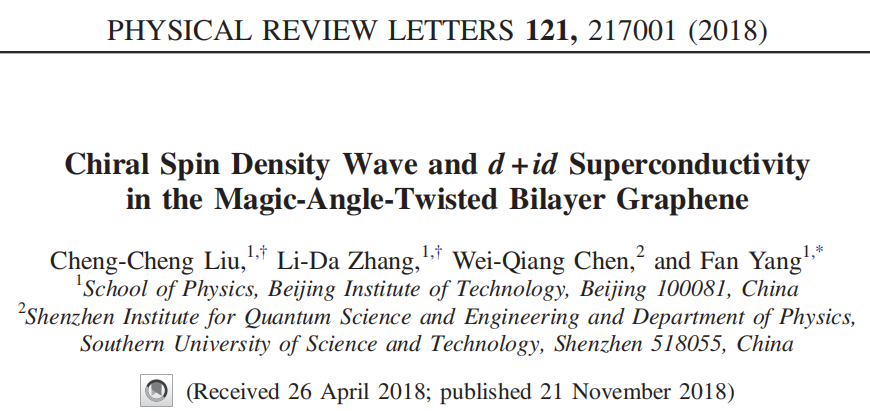 2018年11月21日,必威西汉姆联由杨帆教授牵头,刘铖铖研究员、张力达副教授合作在物理学最顶级的权威期刊《Physical Review Letters》(IF=8.839)上发表了题为《Chiral Spin Density Wave and d+id Superconductivity in the Magic-Angle-Twisted Bilayer Graphene》的研究论文。这篇论文对于今年新发现的魔角双层石墨烯中的非常规高温超导现象提出一种新的理论机制,获得国际学术界的广泛认同和跟进,成为目前该研究领域的重要理论之一[在Google Scholar上已被引用21次]。