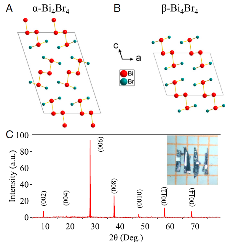 图1. (A)α-Bi4Br4和(B)β-Bi4Br4的准一维晶体结构;(C)α-Bi4Br4单晶的XRD衍射图。