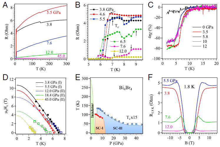 图3. 不同压力和磁场下Bi4Br4单晶的电阻、交流磁化率、上临界场以及温度-压力相图。